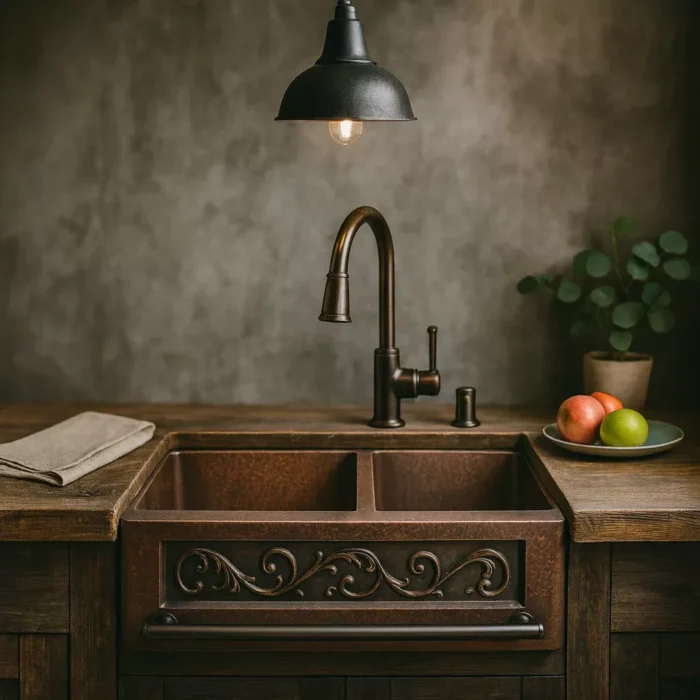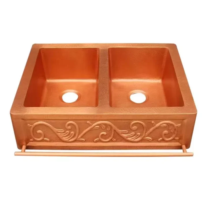 Handmade Copper Farmhouse Sink Double Bowl with Decorative Scroll Apron, Hammered Apron Front Kitchen Sink – Vintagecopperdecor | Custom Copper & Brass Range Hoods for Luxury Kitchens