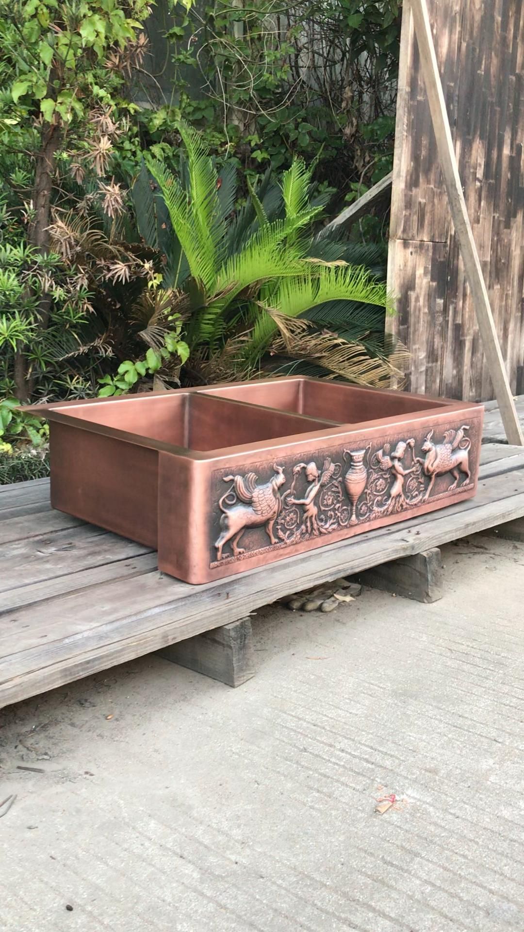 Built from 36x22x8inches with double bowl. Brush and aged copper looking and with a nice sealant. Welcome contact us to built your copper farmhouse sinks.