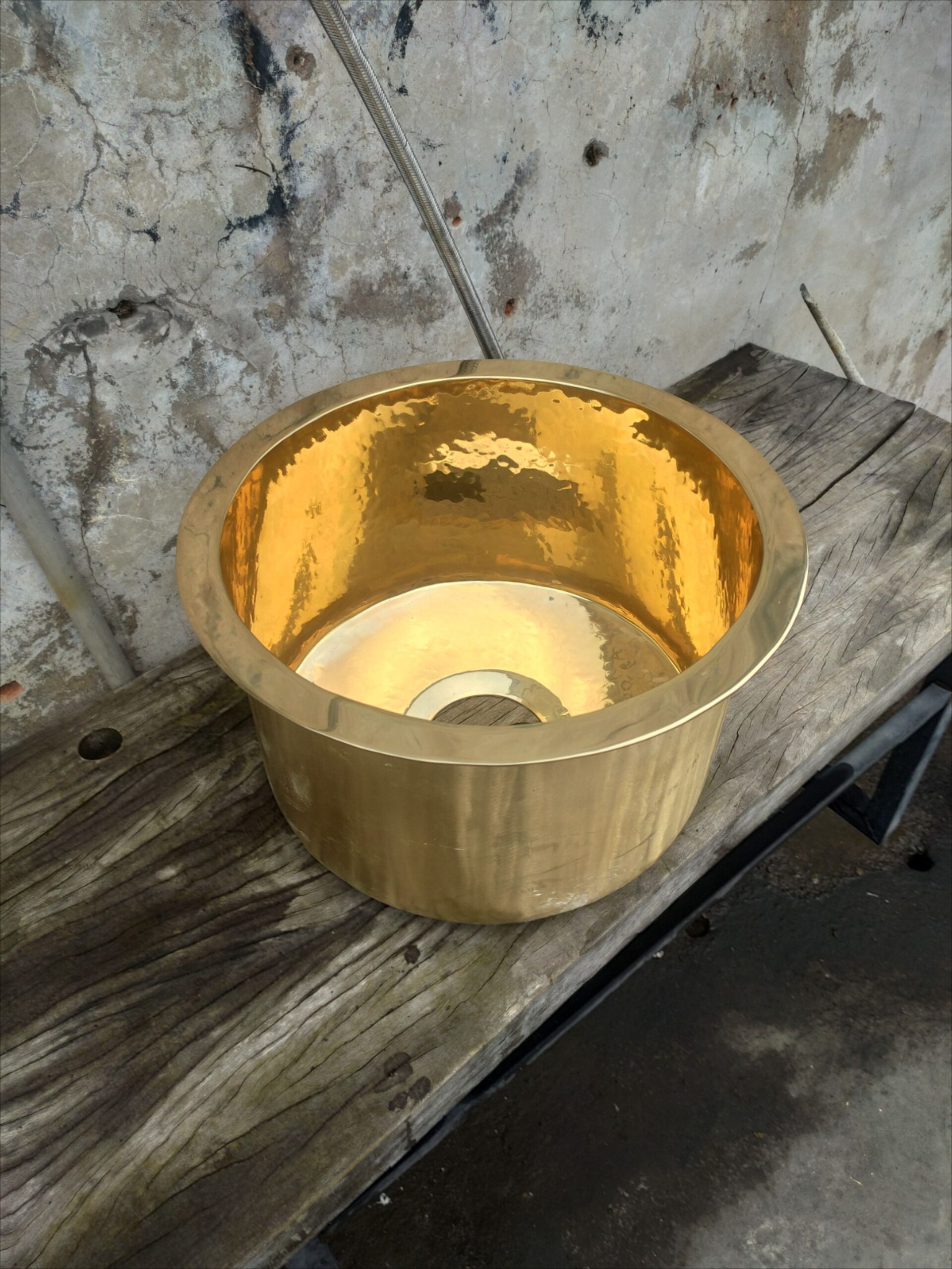 That is super heavy brass round bar sinks made from 14gauge/2mm brass sheet, with a hammer and shinny polish. Look perfect! It can be customized in dimension and shape and even material options