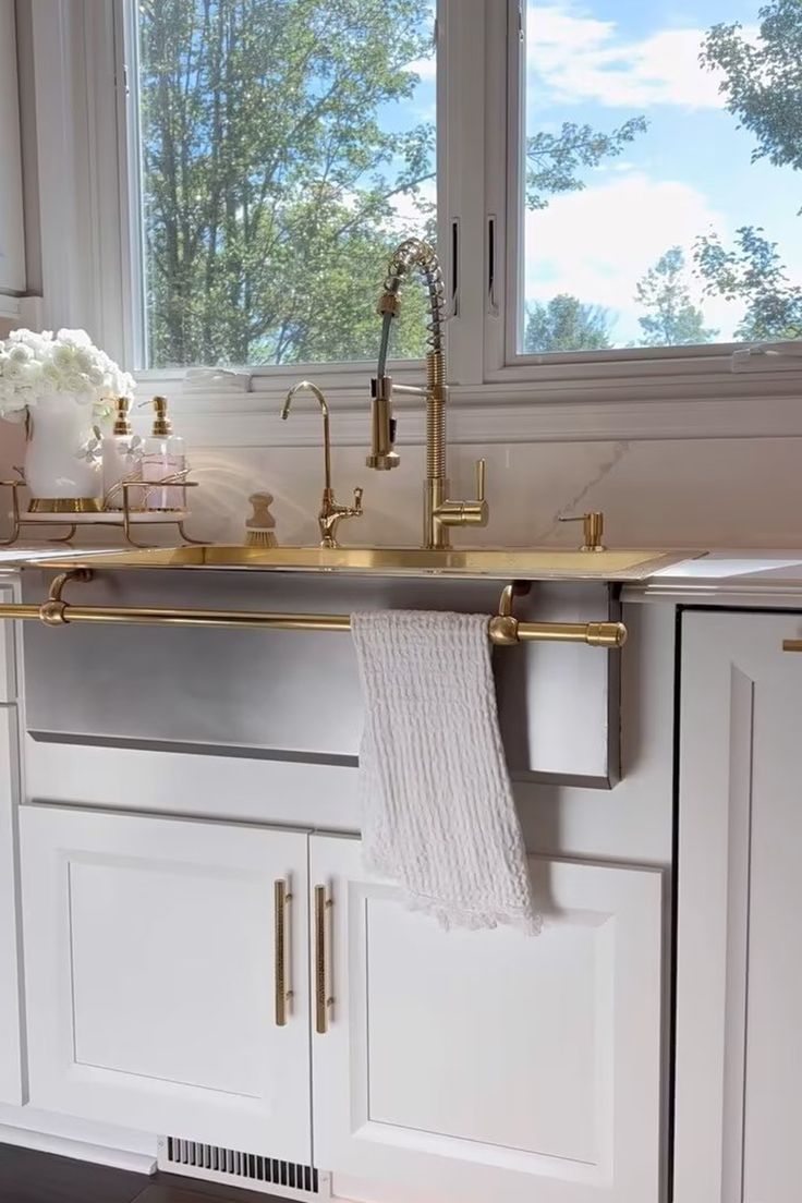 Hottest new Kitchen and Bath Trends–Stainless Steel Kitchen Sinks with Brass Trim and Tower Bar