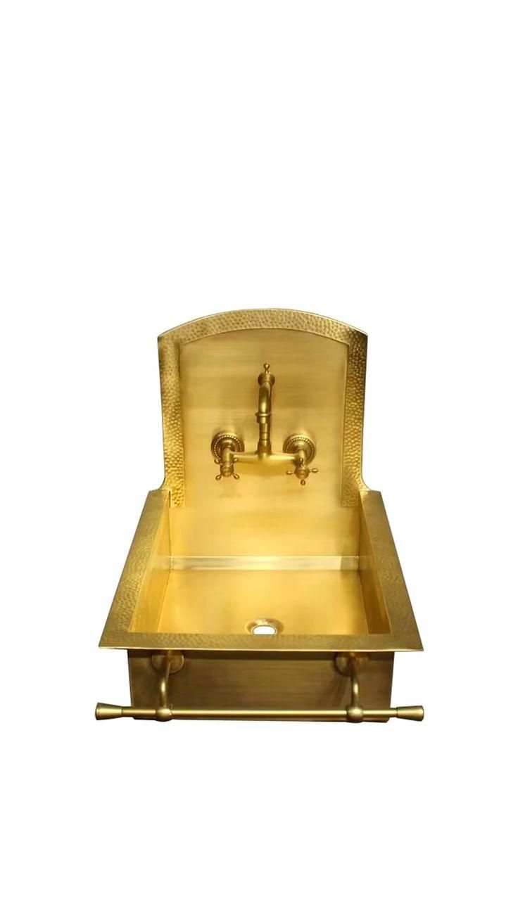 Build from 2mm thickness brass and with nice polish and no lacquer, It will turn a patina looking after time past. Nice design and back splash and with faucet holes