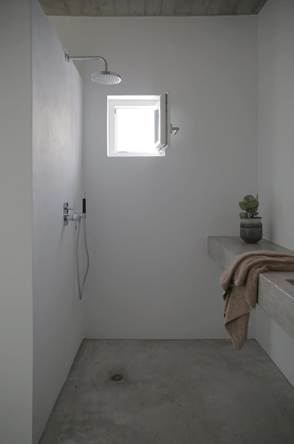concrete shower with floating concrete shelf and waterfall shower faucet