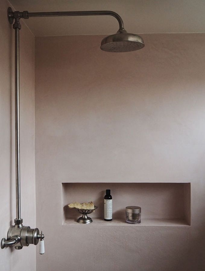 pink plaster walls | pink bathroom | pink shower