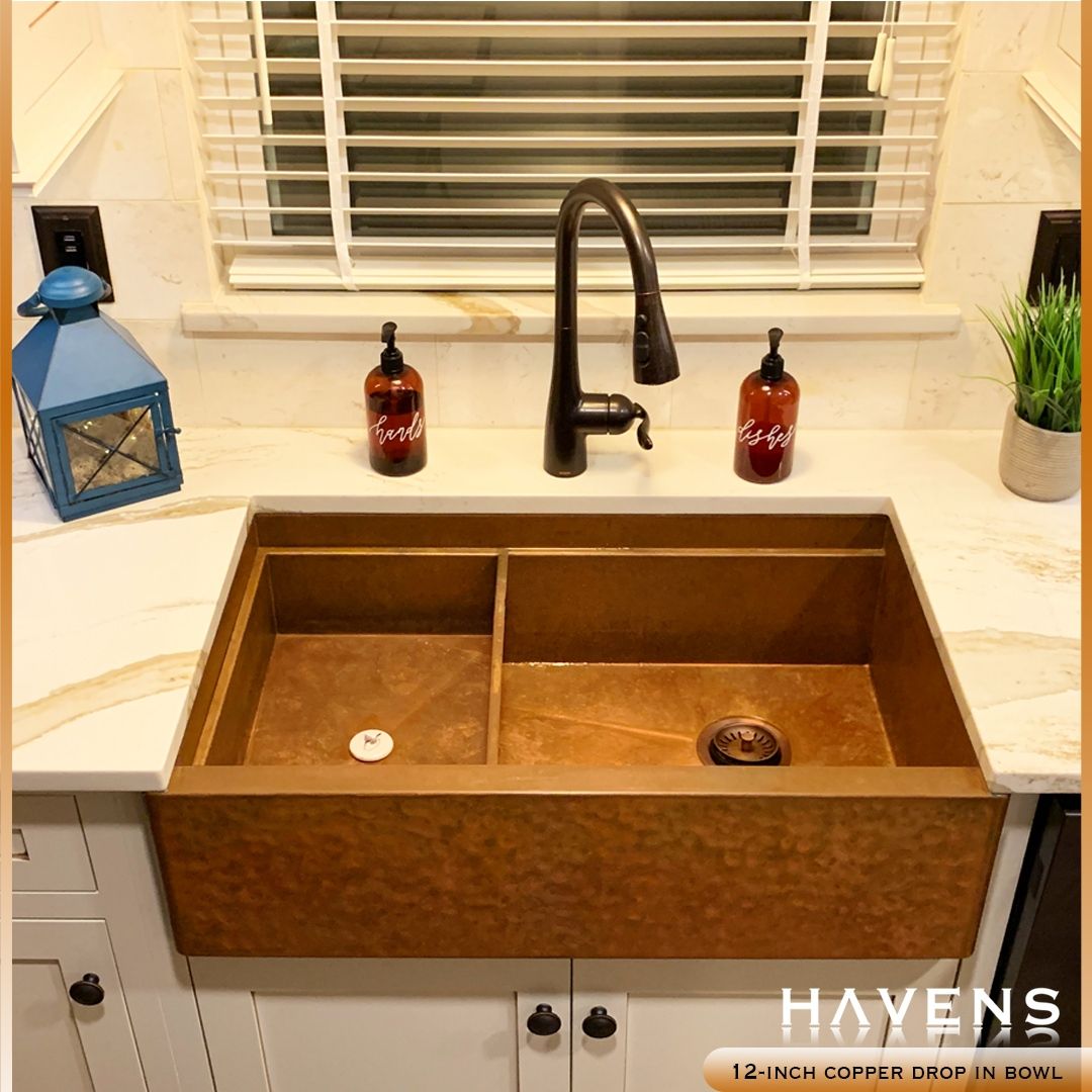 Can’t decide between a double bowl or a single bowl for your kitchen sink? This beautiful Hammered Copper Farmhouse Sink features a Drop-In Bowl! The easy drop-in design slides right onto the built-in ledge, then slides right out when you’re finished. HavensMetal.com #highendinteriors