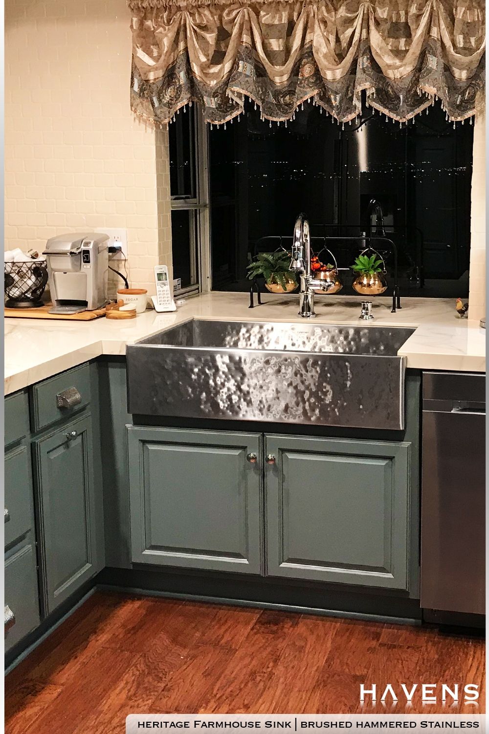 Who doesn’t love the cozy look of a country-style kitchen? The Heritage Farmhouse Sink in Brushed Hammered Stainless makes the perfect focal point for this charming kitchen complemented perfectly with the beautiful muted blue-green tones of the painted cabinets. HavensMetal.com #farmhouse #rustichome