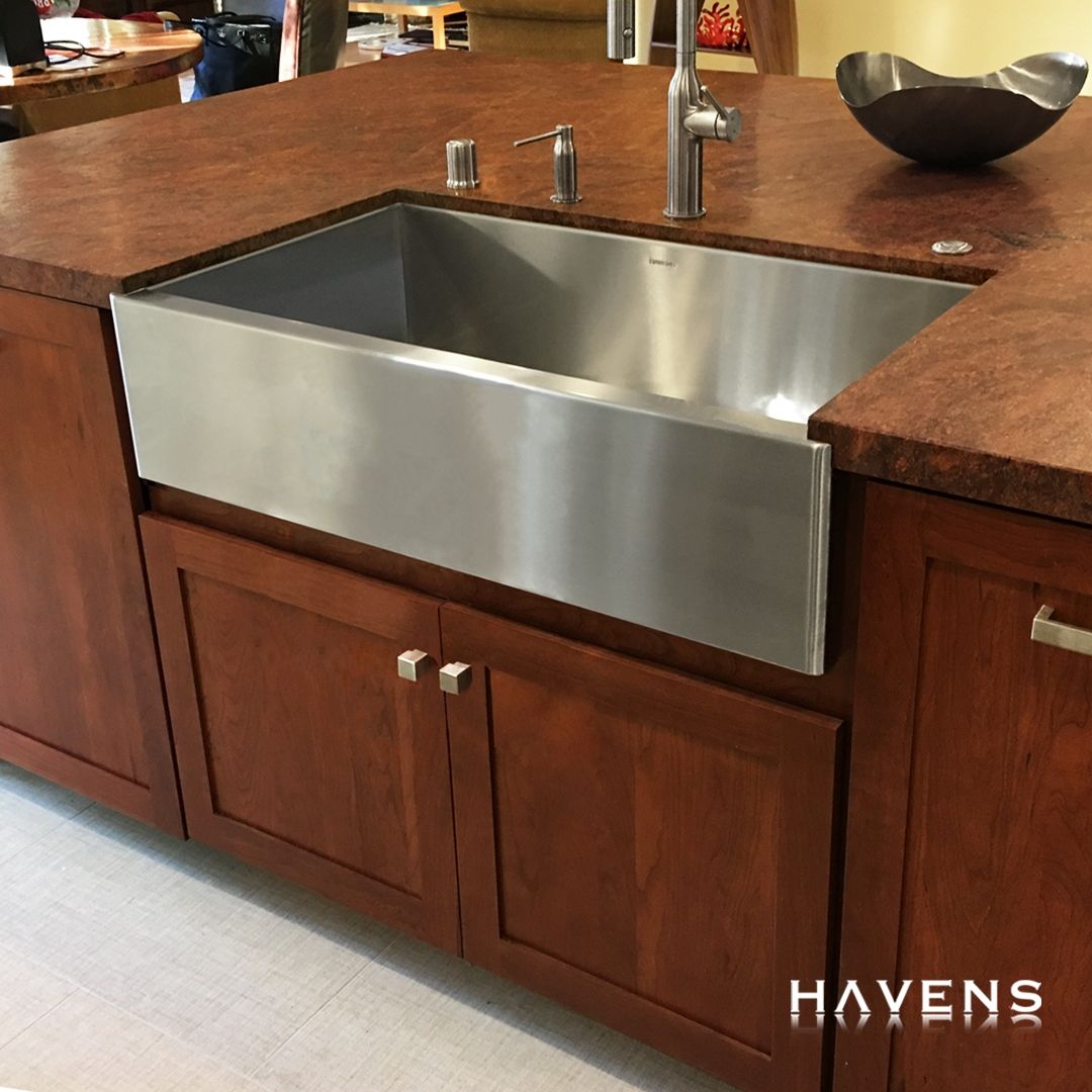This kitchen island, featuring the timeless combination of stainless paired with dark wood shaker cabinets, beautifully showcases our Heritage Farmhouse Sink ✨ #farmhousekitchen #mixedmetals #farmhousesink