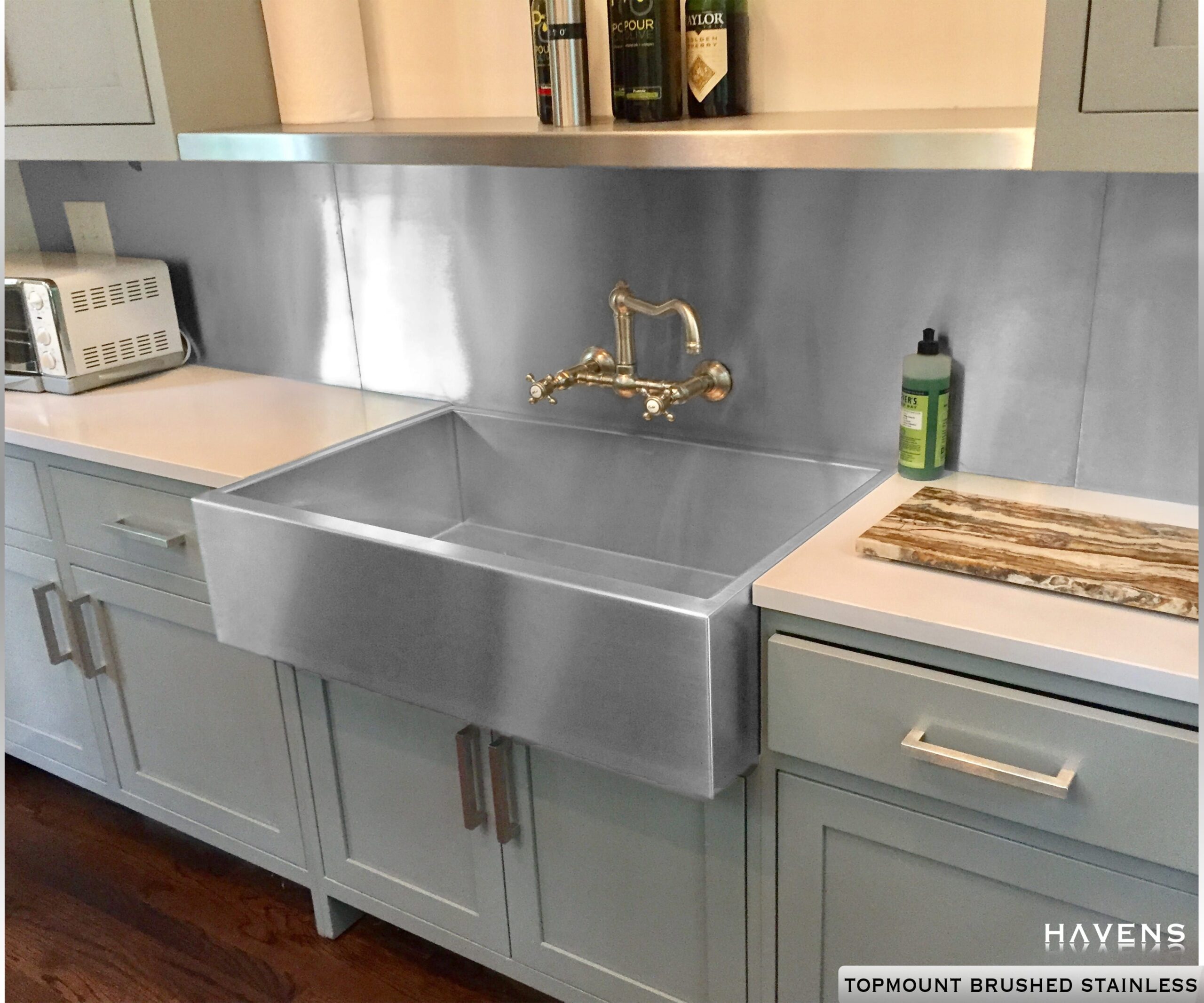 Great contemporary kitchen design featuring our Topmount Brushed Stainless Sink! The mixed metals and metal backsplash really make this kitchen stand out. HavensMetal.com HavensGallery.com #kitchenremodel #interiordesign