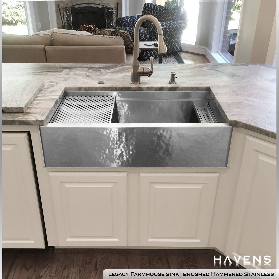 The Legacy Farmhouse Sink in Brushed Hammered Stainless looks stunning in this open floor plan kitchen 🤩 HavensMetal.com #openkitchen #whitekitchen #stainlesssteel