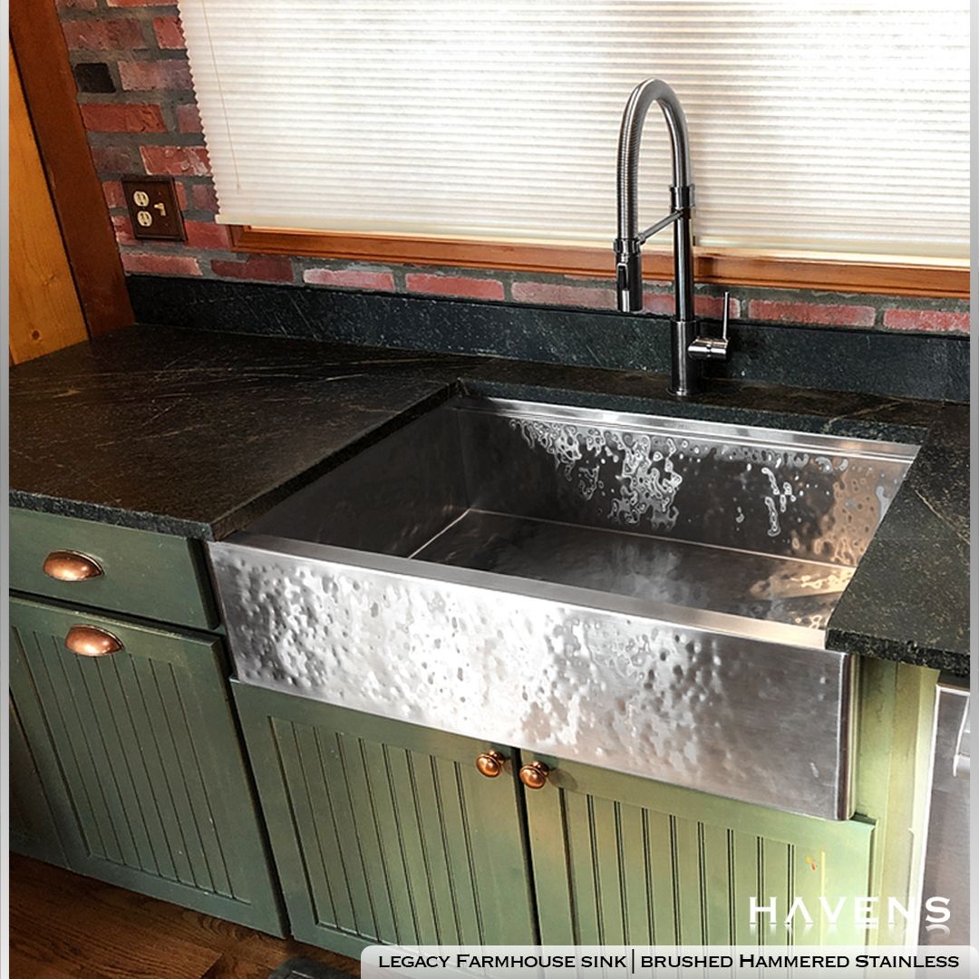 The Legacy Farmhouse Sink in Brushed Hammered Stainless makes for a stunning focal point for any rustic cottage kitchen. The apron front design is a must-have stable for anyone craving a farmhouse look, and the hand-hammered stainless steel is the perfect option for a rustic finish. HavensMetal.com HavensGallery.com #gre
