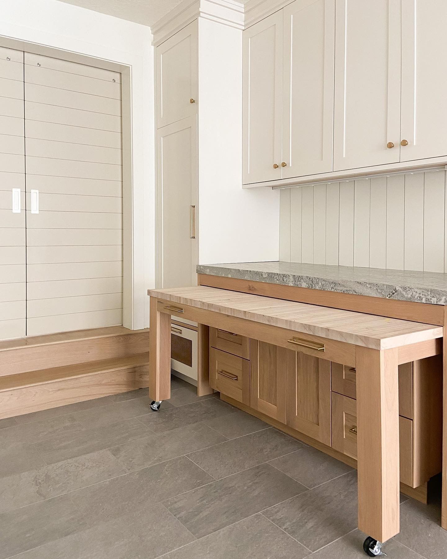 Clearstone Builders | Classy yet playful. We love the pull out craft table in this calming laundry hall. Architect and Designer: @by_abigail_hill | Instagram