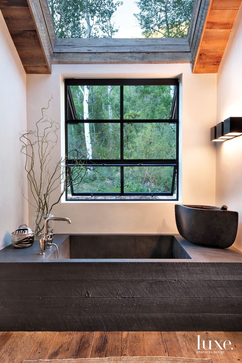 Hallworth based her design of the master bathroom’s 48-inch-deep, board-formed, black-concrete tub on a traditional Japanese soaking tub. “I wanted it to be earthy,” she says. Tillotson-Miller cleverly added a skylight above. “To be in the tub at night and look up at the stars–how great would that be?” she says.