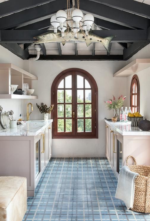 Uncategorized pin_title Posted by redavintage On December 15, 2025 0 comments Blue plaid floor tiles beautifully complement light taupe shaker kitchen pantry cabinets accented with aged brass hardware and a marble countertop fitted over glass front mini-fridges.