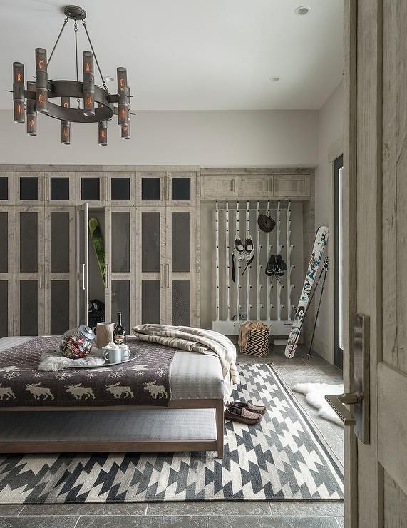 Rustic country cabin mudroom is equipped with gray stained lockers finished with metal grill cabinet doors positioned beside white ski racks located beneath gray stained cabinets as a modern chandelier hangs over a large light gray ottoman placed on a black and white rug.