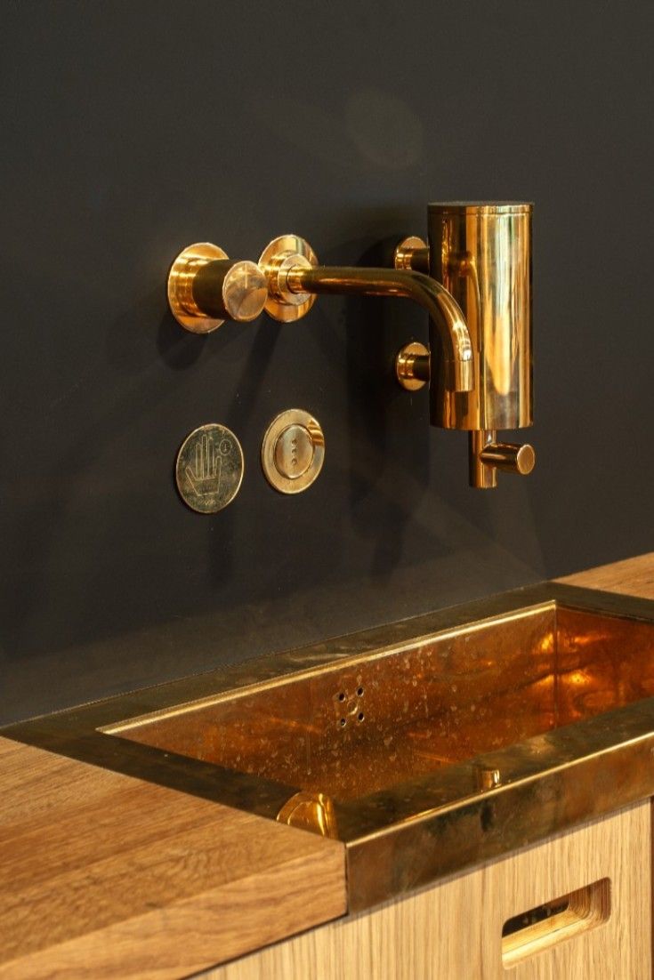 Add brass details to your kitchen design. vintagecopperdecor handsfree tap 4911VS and wall mounted soap pump in natural brass blends perfectly into the wooden countertop and brass sink. Kornets hus by Reiulf Ramstad Arkitekter #vintagecopperdecor #tap #tapware #ha