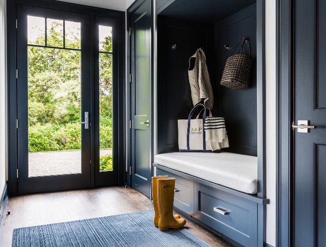 Uncategorized pin_title Posted by redavintage On December 21, 2025 0 comments Dark Blue Mudroom. Dark blue mudroom features a dark blue built in bench fitted with drawers placed under a dark blue backsplash lined with hooks flanked by dark blue closet doors. #Mudroom #darkblue #navy Alisberg Parker