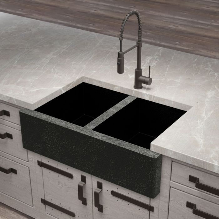 Farmhouse Double Bowl Sink This custom double bowl sink is handcrafted from natural materials. You have the ability to customize this sink by size, finish, metal and texture. Create your masterpiece. Each CopperSmith sink bowl is only available in select living finishes, and the front facing apron is available in all finishes. This is due to our belief that your sink should only have a living finish bowl as natural living metals are the best solution for this application. Read more Commitment to Quality and Customer Service The copper double farmhouse sink comes in many dimensions to provide the most secure fit within your kitchen countertop. These sizes range from: 30” to 42”. With a diameter of 3.5 inches, the drain hole is sized to fit most standardized kitchen plumbing. When measuring the outer dimensions of the custom sink, deduct two inches (for the rim) to find the inner dimensions. All CopperSmith® sinks are handmade by talented artists using only the finest materials. Due to the handmade nature of this hammered copper farmhouse sink, variances are not considered defects.