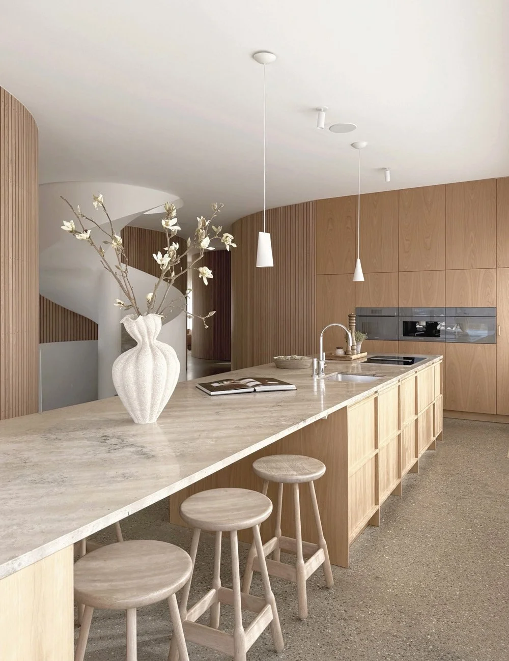 Perched atop a hill with sweeping views of the shimmering lake Mälaren, in Stockholm, lies House G – an architect-designed villa that masterfully blends minimalist design with soft, organic forms. The light oak kitchen, by Nordiska Kök, features tall, seamless cabinets and rustic, clean lines, blending effortlessly with the home’s architectural character while infusing the space with a warm, inviting atmosphere.