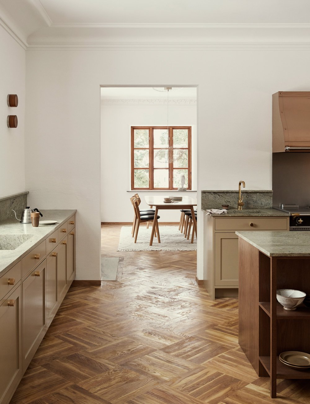 A beautiful kitchen with a rustic character, balanced by Scandinavian design principles in a warm and harmonious composition. Painted in Nordiska Kök’s colour Desert Clay — a soft, earthy clay tone that brings calm and warmth to the space. The Lemon Ice granite worktop, with its subtle green hues, adds a sense of permanence, as if the kitchen has always belonged in the magnificent villa in Stockholm.