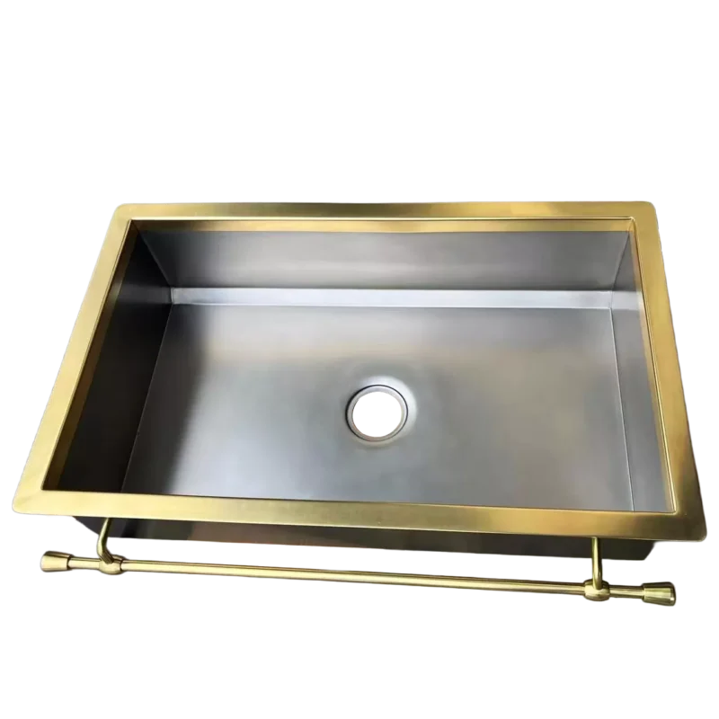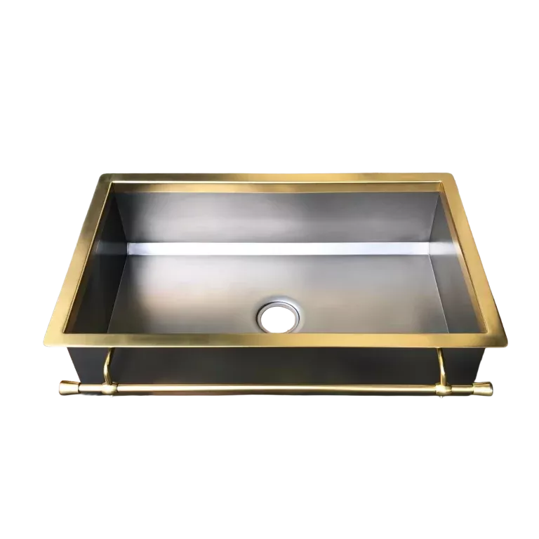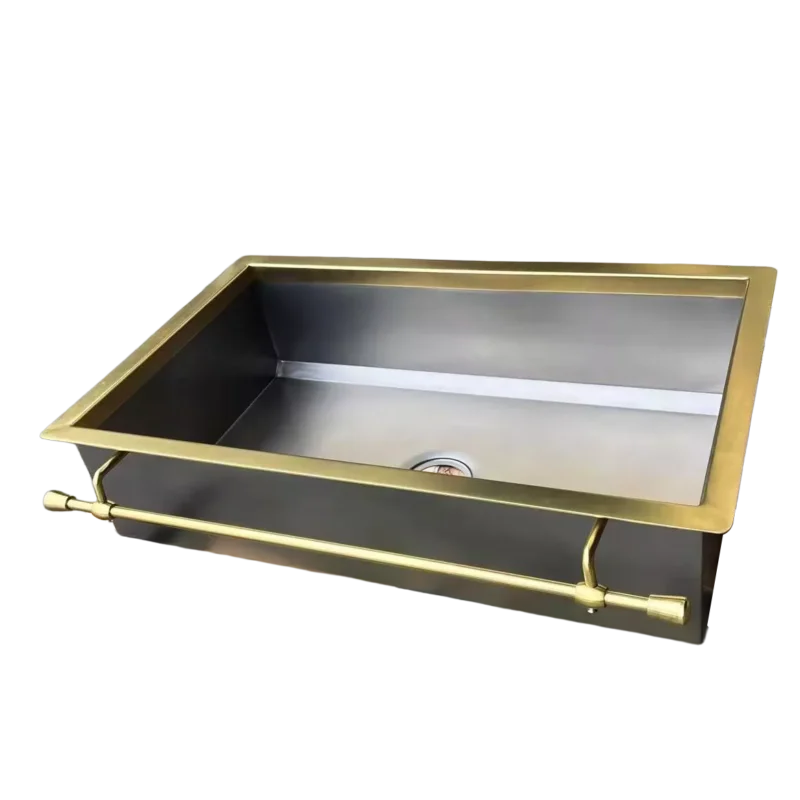 Modern Stainless Steel Kitchen Sink with Brass Apron & Towel Bar – Farmhouse Style – Vintagecopperdecor | Custom Copper & Brass Range Hoods for Luxury Kitchens