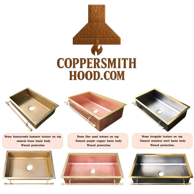手工黄铜厨房水槽,带精细锤打边缘和毛巾杆 - Vintagecopperdecor | 为豪华厨房定制铜和黄铜抽油烟机