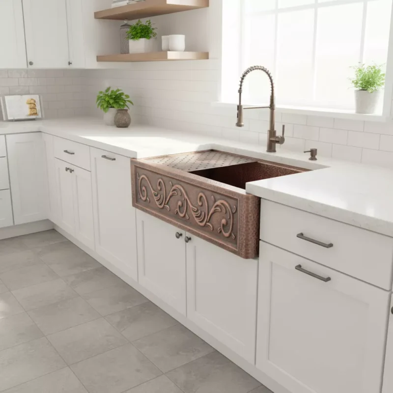 Handmade Copper Farmhouse Sink with Embossed Apron Scroll Design – Hammered Single Bowl Workstation with Drying Rack – Vintagecopperdecor | Custom Copper & Brass Range Hoods for Luxury Kitchens