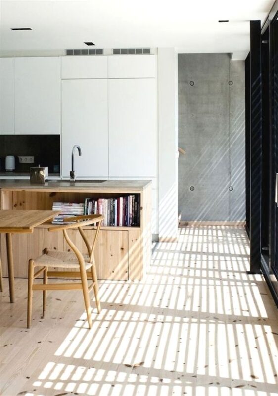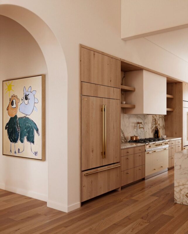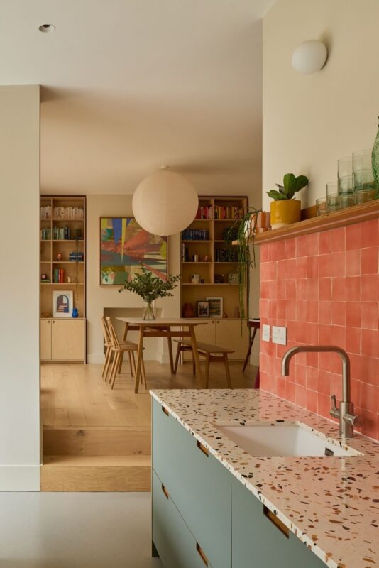 A pink and green plywood kitchen, with oak grab handles, a modern kitchen island and terrazzo worktop. Featuring Fenix NTM in Verde Kit...