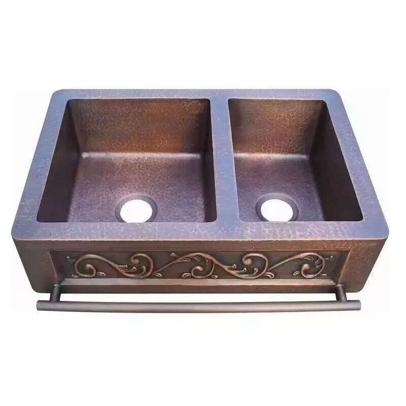Handmade Copper Farmhouse Sink Double Bowl with Decorative Scroll Apron, Hammered Apron Front Kitchen Sink – Vintagecopperdecor | Custo...