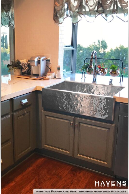 The Heritage Farmhouse Sink in Brushed Hammered Stainless looks stunning in this…