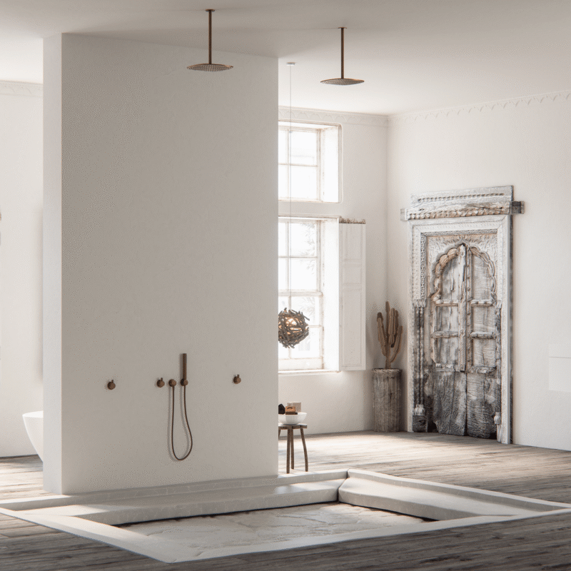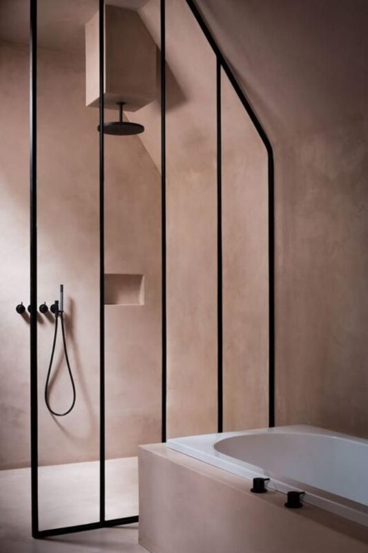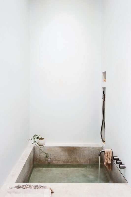 The ultimate one-off: a sculpted bath or shower enclosure made from lime plaster, concrete, or Tadelakt—a Moroccan pigmented plaster. H...