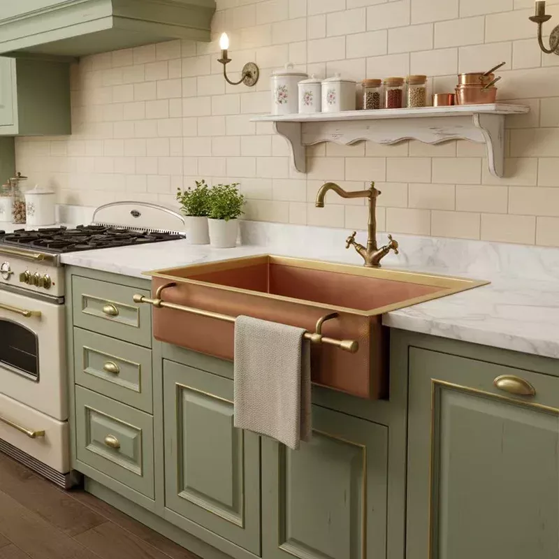 • Handcrafted Copper Kitchen Sink with Brass Towel Bar & Fine Sand Texture Rim – Farmhouse Apron Front Design – Vintagecopperdecor | Custom Copper & Brass Range Hoods for Luxury Kitchens