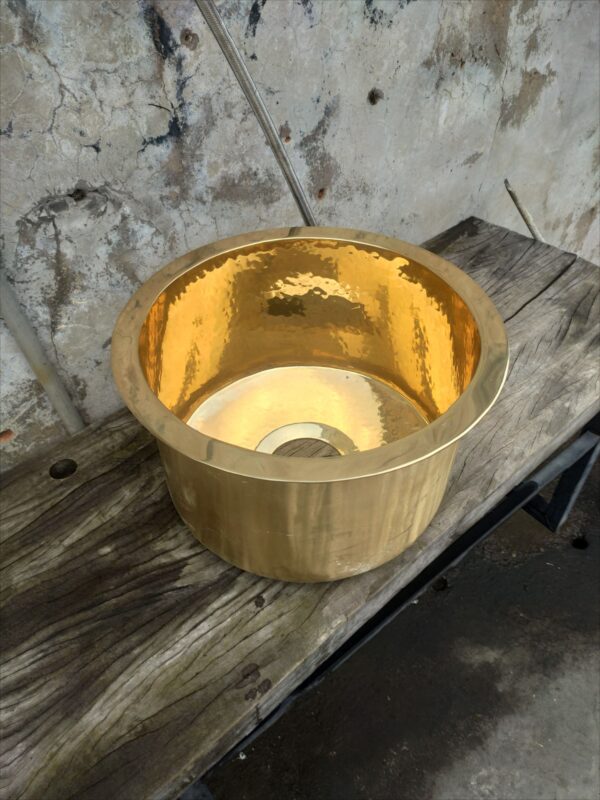 That is super heavy brass round bar sinks made from 14gauge/2mm brass sheet, with a hammer and shinny polish. Look perfect! It can be c...