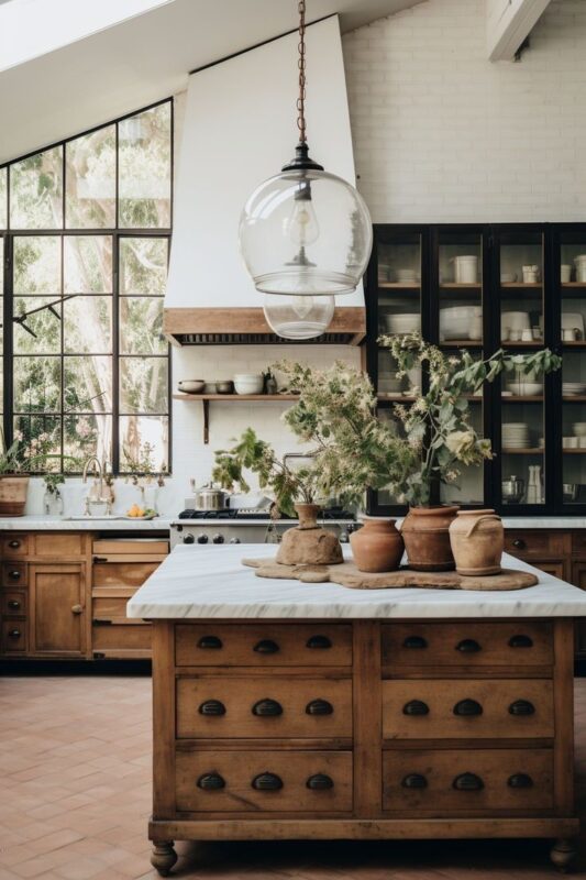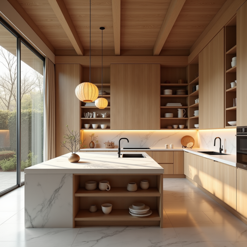 Discover a serene Japandi kitchen where warm ash wood meets white quartz in a spacious layout. Innovative staircase integration adds st...