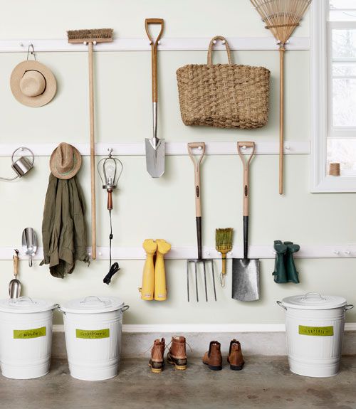 Organize your garage with three rows of Shaker-style peg rails from which to hang tools. #storage #organize