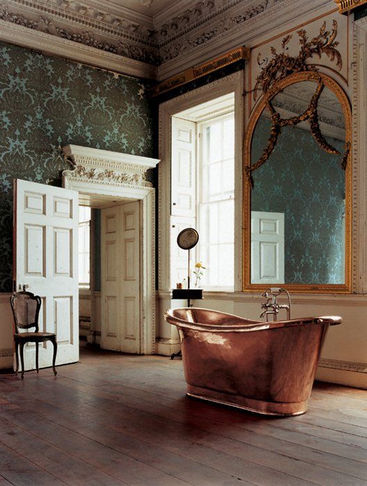Beautiful. I love slipper tubs, and I love copper/brass finishes. The ethereal curtain adds a nice touch. Not necessarily my very favor...