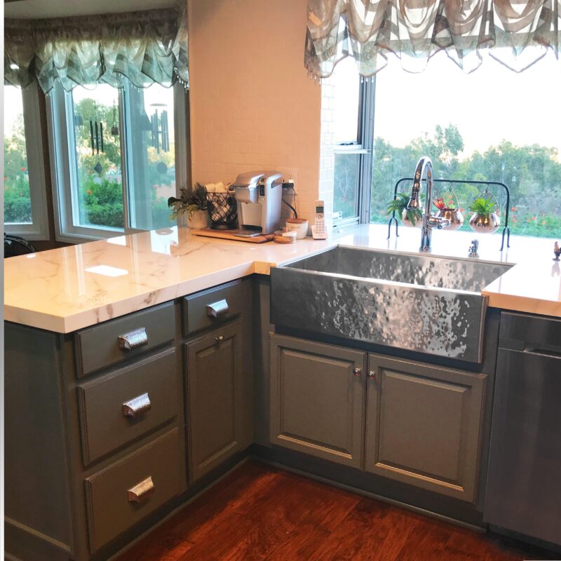 We love the painted cabinets in this rustic cottage kitchen 🥰 This charming kitchen features the Legacy Farmhouse Sink in Brush...