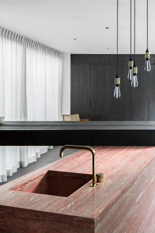 vintagecopperdecor tap 590 in Natural Brass seen combined with natural pink stones. For more inspiration about the poolhouse in Belgium...