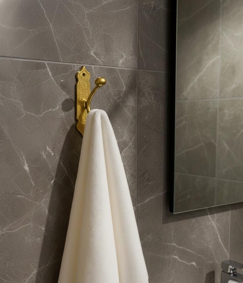 Bring warmth and character to your walls with this unlacquered brass double coat hook, a handmade Moroccan wall hook perfect for hanging towels, coats, robes, or bags. Crafted in solid brass by skilled artisans, it blends vintage charm with everyday function, making it ideal for the bathroom, entryway, bedroom, or kitchen.