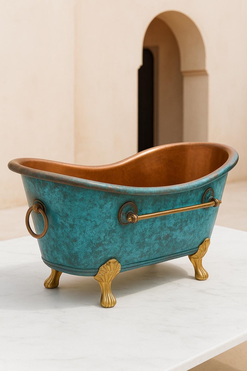 Unique Patina Finish: Naturally aged blue-green tones — each tub develops its own organic color variations.