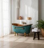 The blue patina finish gives this bathtub its distinct character — a mesmerizing blend of turquoise, aqua, and aged copper tones that evoke coastal calm and artistic charm. Subtle hammer marks and tool impressions celebrate traditional craftsmanship, turning every piece into a functional work of art.
