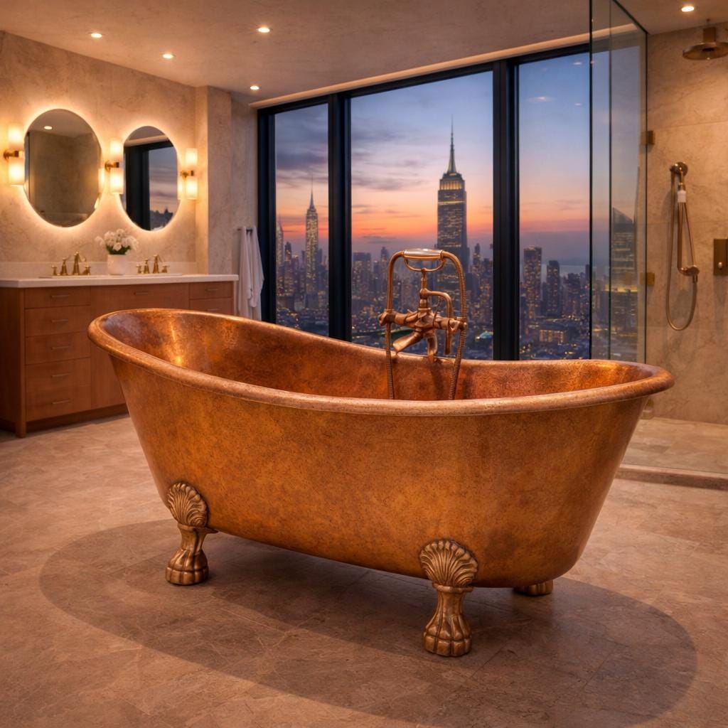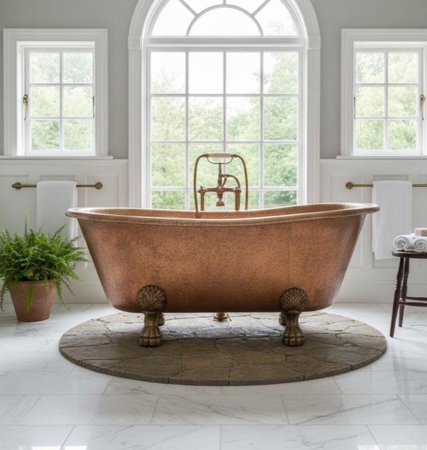 Real copper brings warmth, a soft natural glow, and the kind of patina that slowly turns your bath into a piece of bath tub art. Whether you style it in a rustic farmhouse space or a modern spa bathroom, this copper tub instantly becomes the focal point of the room.
