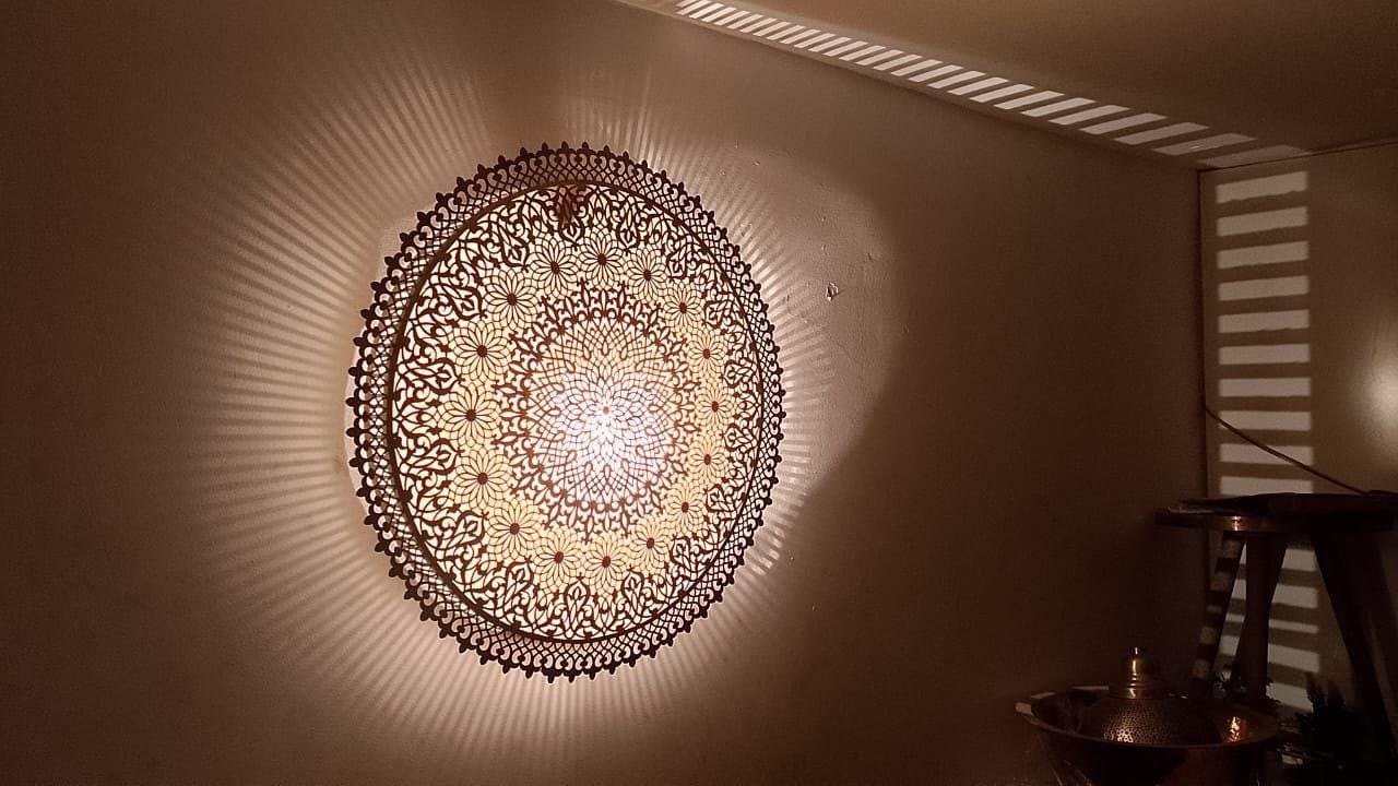 Perfect for boho, Moroccan, art deco, and eclectic interiors, this brass wall lamp brings authentic craftsmanship and exotic elegance into your living room, bedroom, hallway, or reading nook.