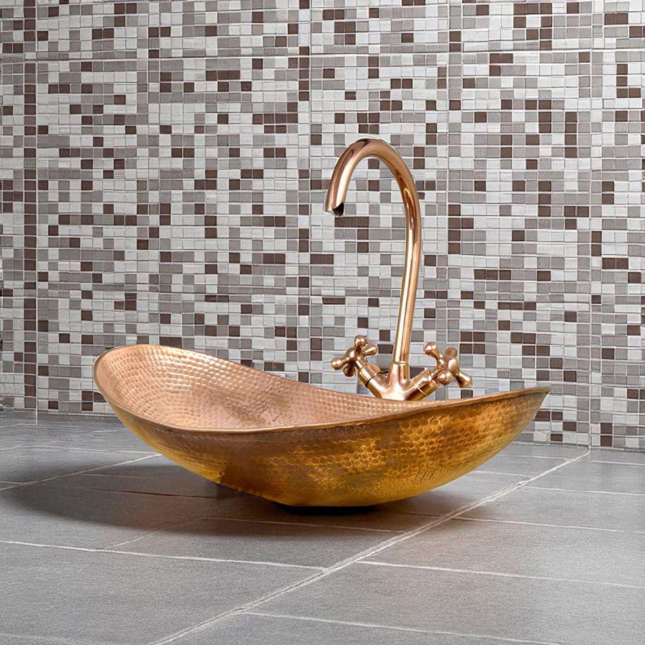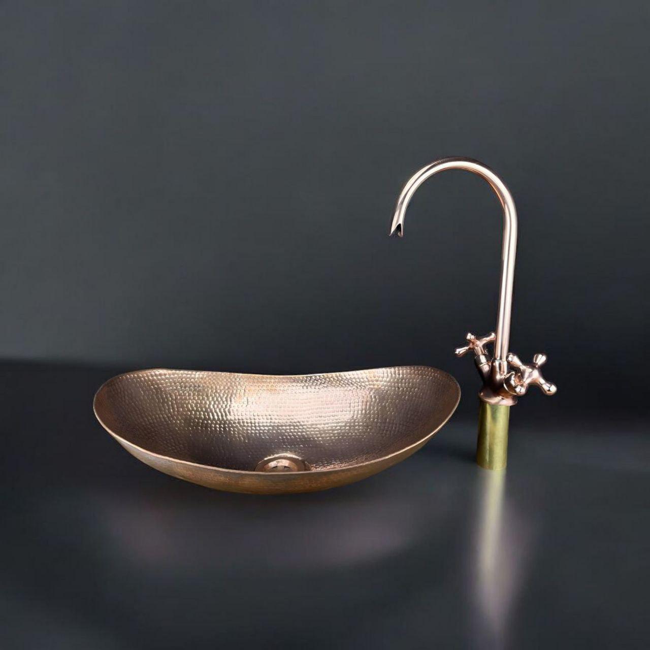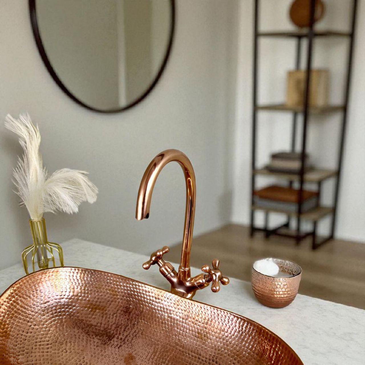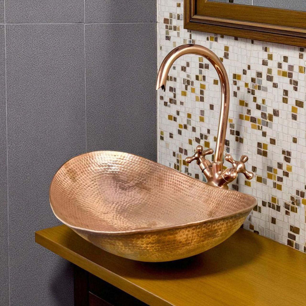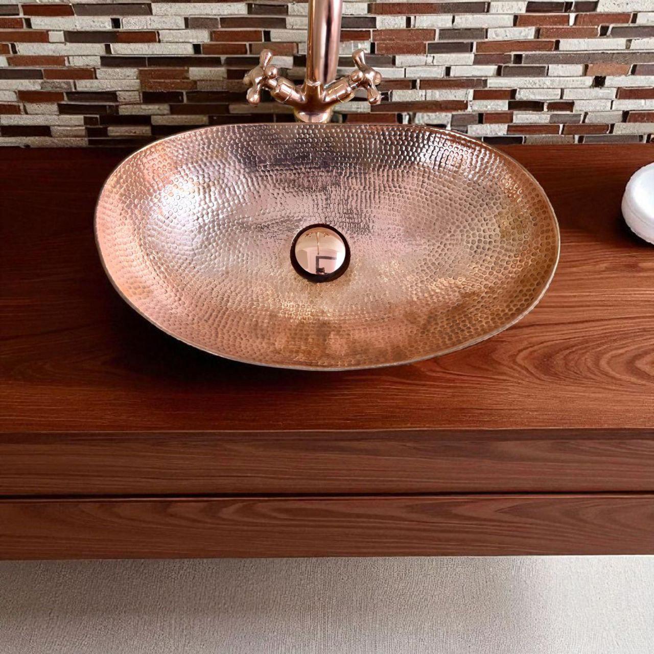 Upgrade your bathroom with this luxury copper oval vessel sink and matching faucet set, handcrafted by skilled artisans for timeless beauty and exceptional durability. Made from 100% solid unlacquered copper, this sink naturally develops a rich, warm patina over time, giving your space a unique vintage character.