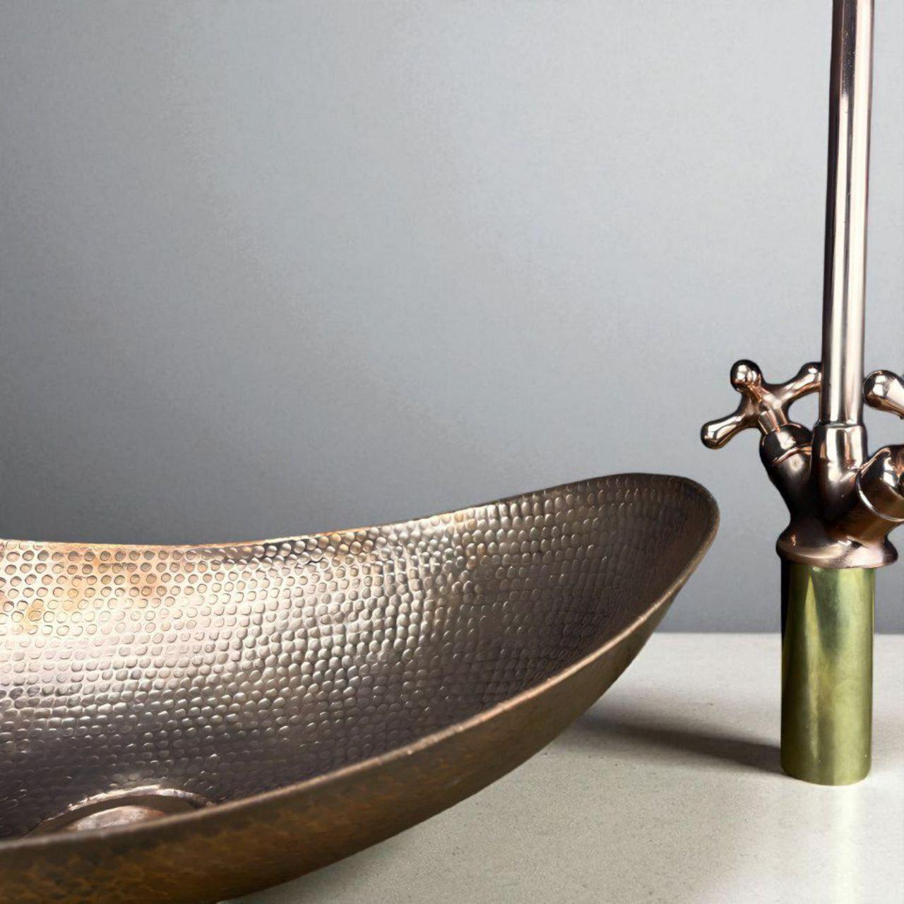 Hand-Hammered Copper Oval Vessel Sink with Faucet – Unlacquered Copper Bathroom Basin with Natural Patina – Farmhouse Rustic Vanity Sink Set