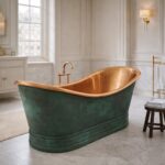 Add a bathtub tray, soft towels, or a bathtub curtain for a spa-like oasis. Whether paired with a minimalist shower curtain or displayed as a statement centerpiece, this hammered copper bathtub creates a luxurious yet earthy atmosphere in your bathroom.
