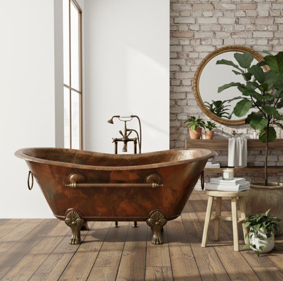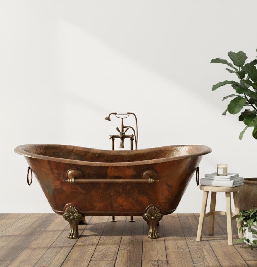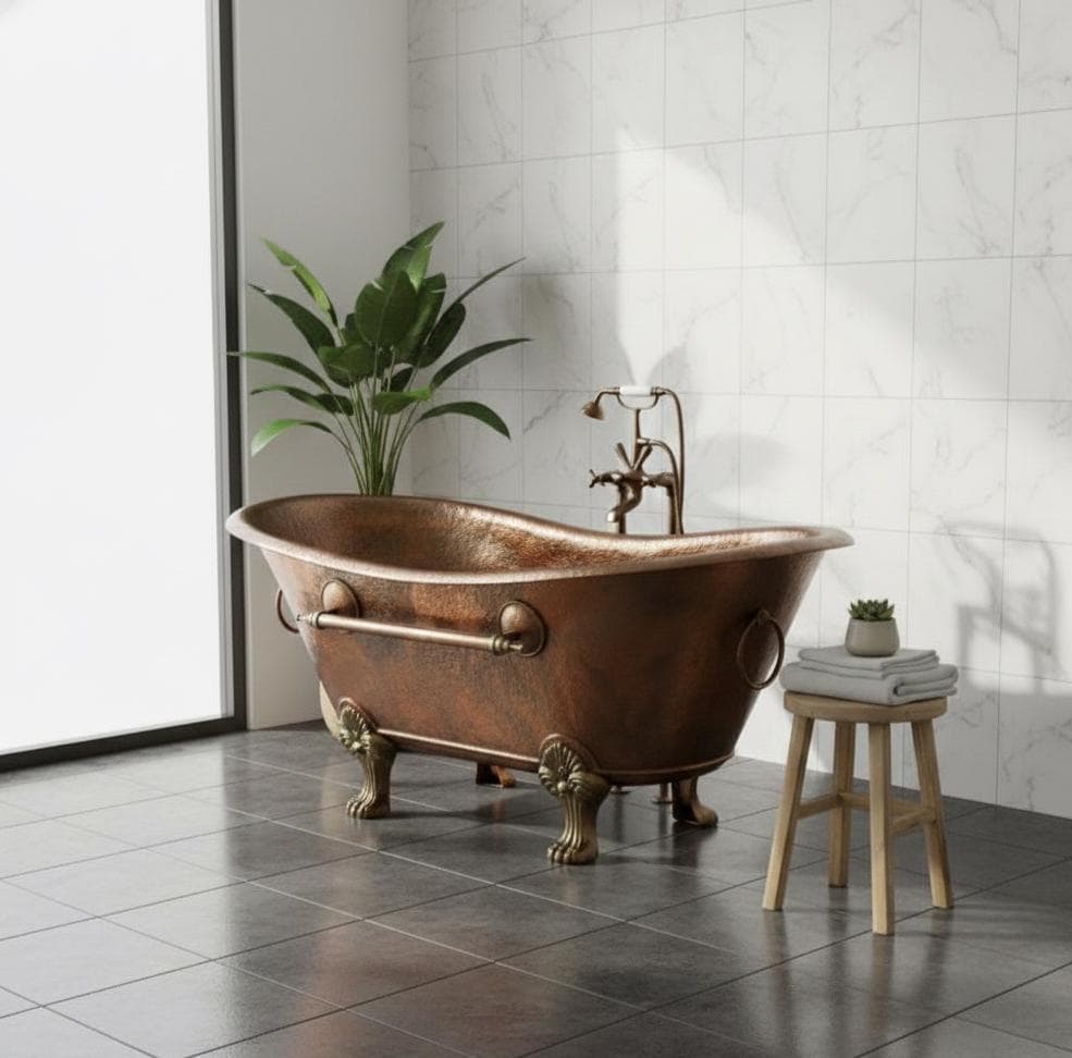 Create a rustic oasis with this handmade copper clawfoot bathtub—a showstopping centerpiece with a rich, natural patina that develops character over time. The freestanding design, classic lion’s-paw feet, and deep basin deliver a spa-like soak with vintage elegance. Perfect for farmhouse, rustic, or modern luxury spaces.