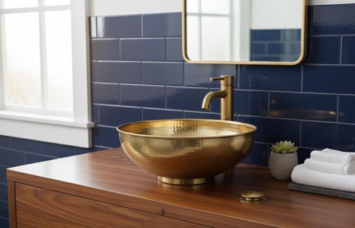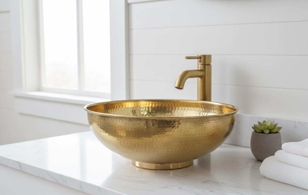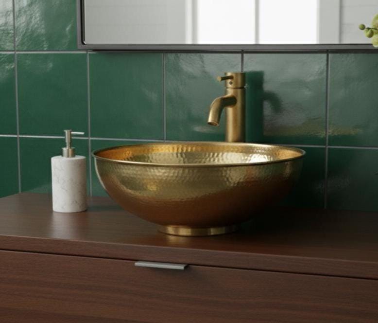 Bring timeless elegance and artisan quality to your bathroom with this handmade brushed brass vessel sink. Crafted from 100% solid 16-gauge brass, each basin is hammered by hand for a unique, rustic texture that blends Moroccan craftsmanship with modern farmhouse style.