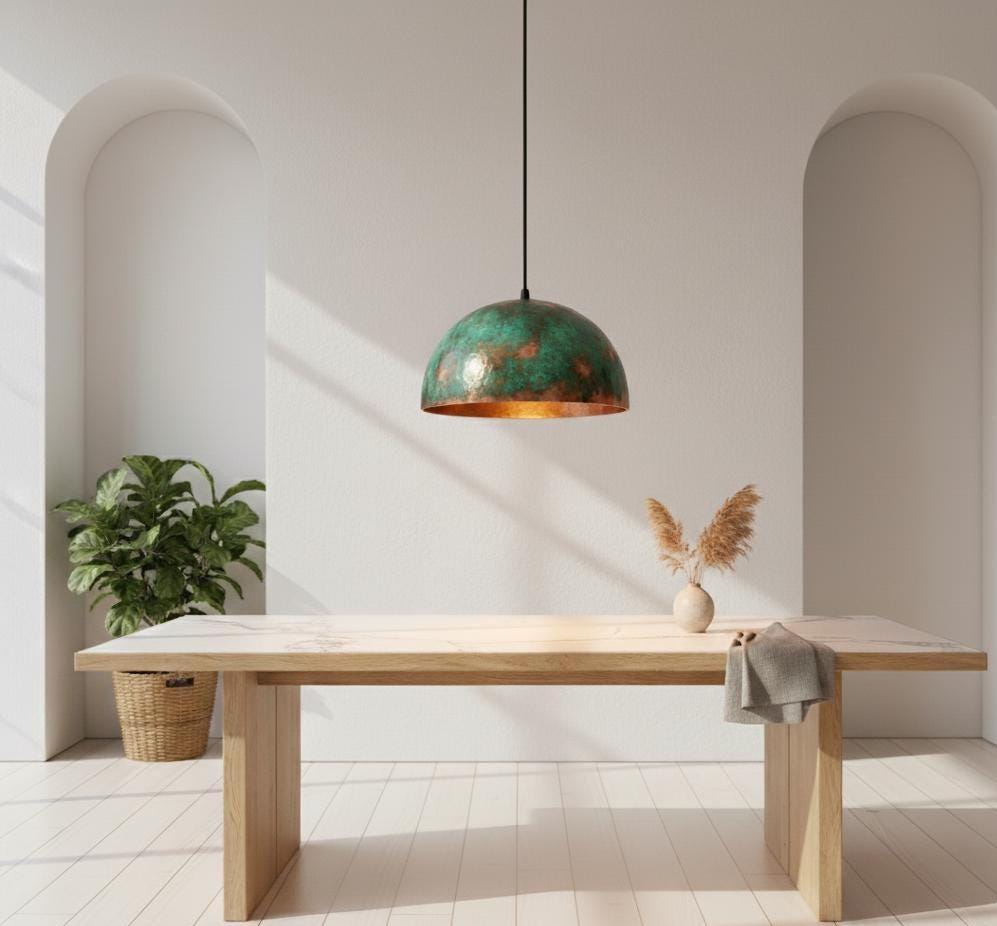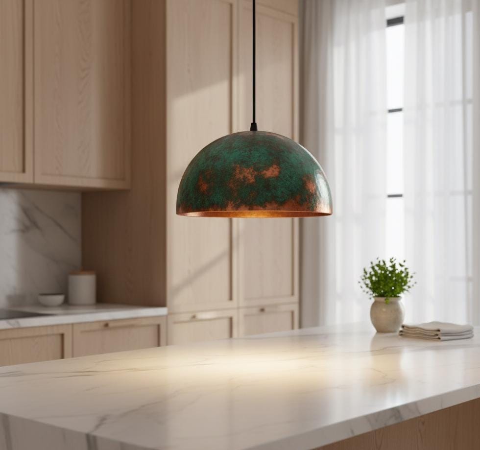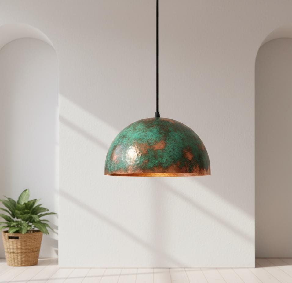 Bring timeless artistry and warmth into your home with our handcrafted Copper Dome Pendant Light, finished in a rich green patina that celebrates the natural beauty of oxidized copper. Each pendant is individually handmade, ensuring that no two pieces are ever the same — each one tells its own story of texture, tone, and craftsmanship.