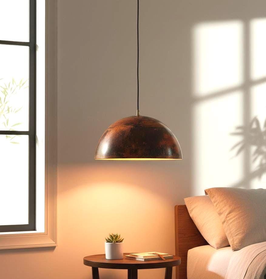 Elevate your kitchen with the warm glow of a hand-finished oxidized copper dome pendant. Solid copper shade, UL E26/E27 socket, and an adjustable 100 cm (40") cord for perfect hanging height. Install in minutes with the included canopy and hardware. Ideal over kitchen islands, dining tables, or a cozy nook. Natural patina variations make each piece one-of-a-kind. (Bulb not included; dimmer-compatible with suitable bulb/switch.)