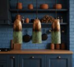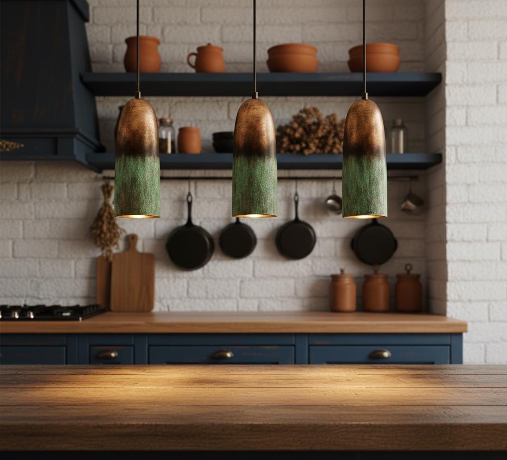 Add rustic charm and handcrafted elegance to your kitchen or dining space with this set of three oxidized copper pendant lights. Featuring a rich green patina finish, each pendant is meticulously crafted from solid copper, bringing warmth and character to any farmhouse, industrial, or modern interior.