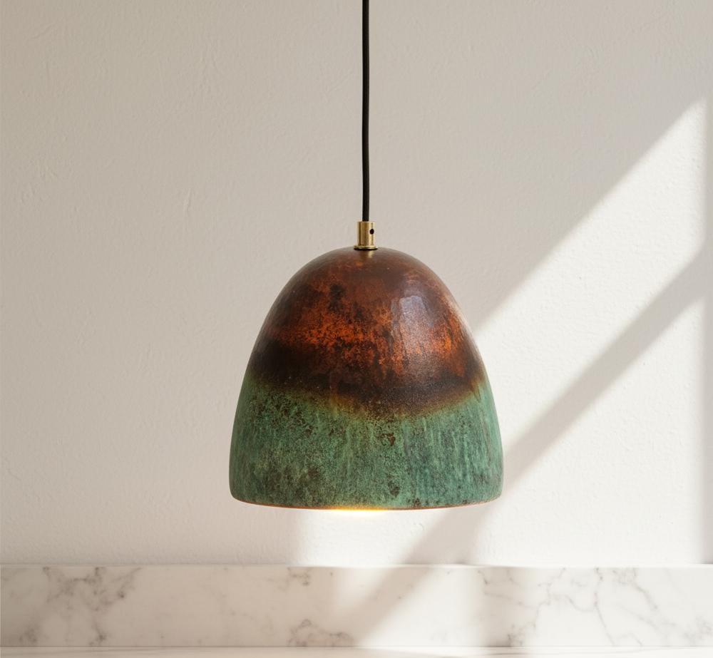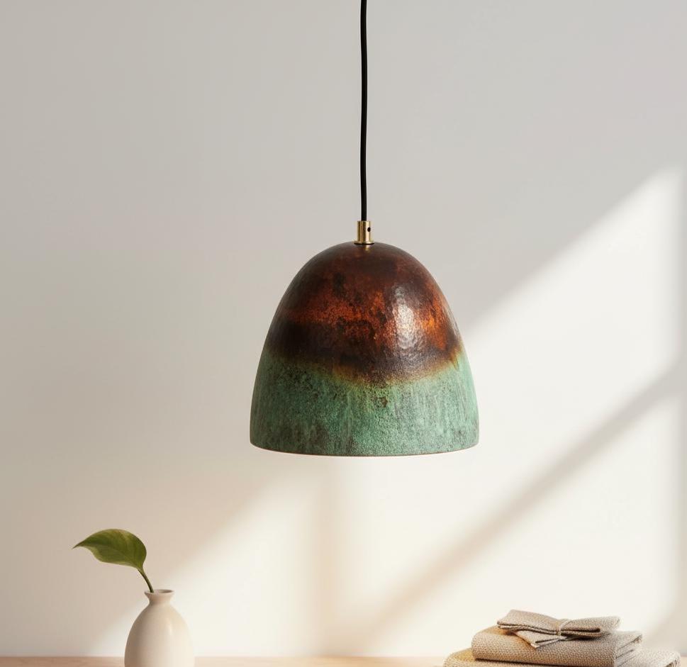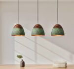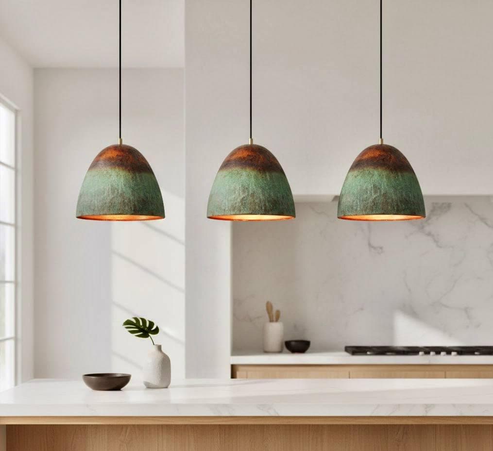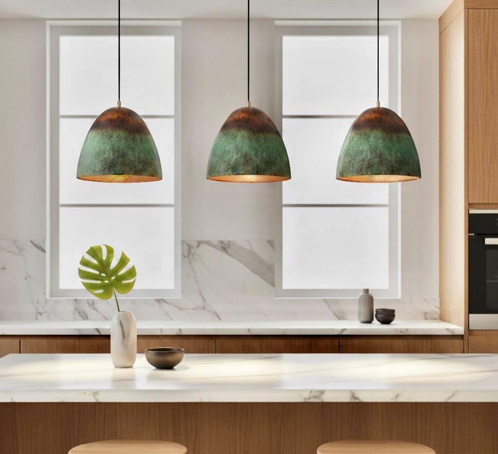 Bring timeless elegance to your home with this set of 3 farmhouse pendant lights, crafted from solid copper with a green oxidized patina. Each dome light is individually handmade by skilled artisans, ensuring unique color variations and an authentic rustic character.